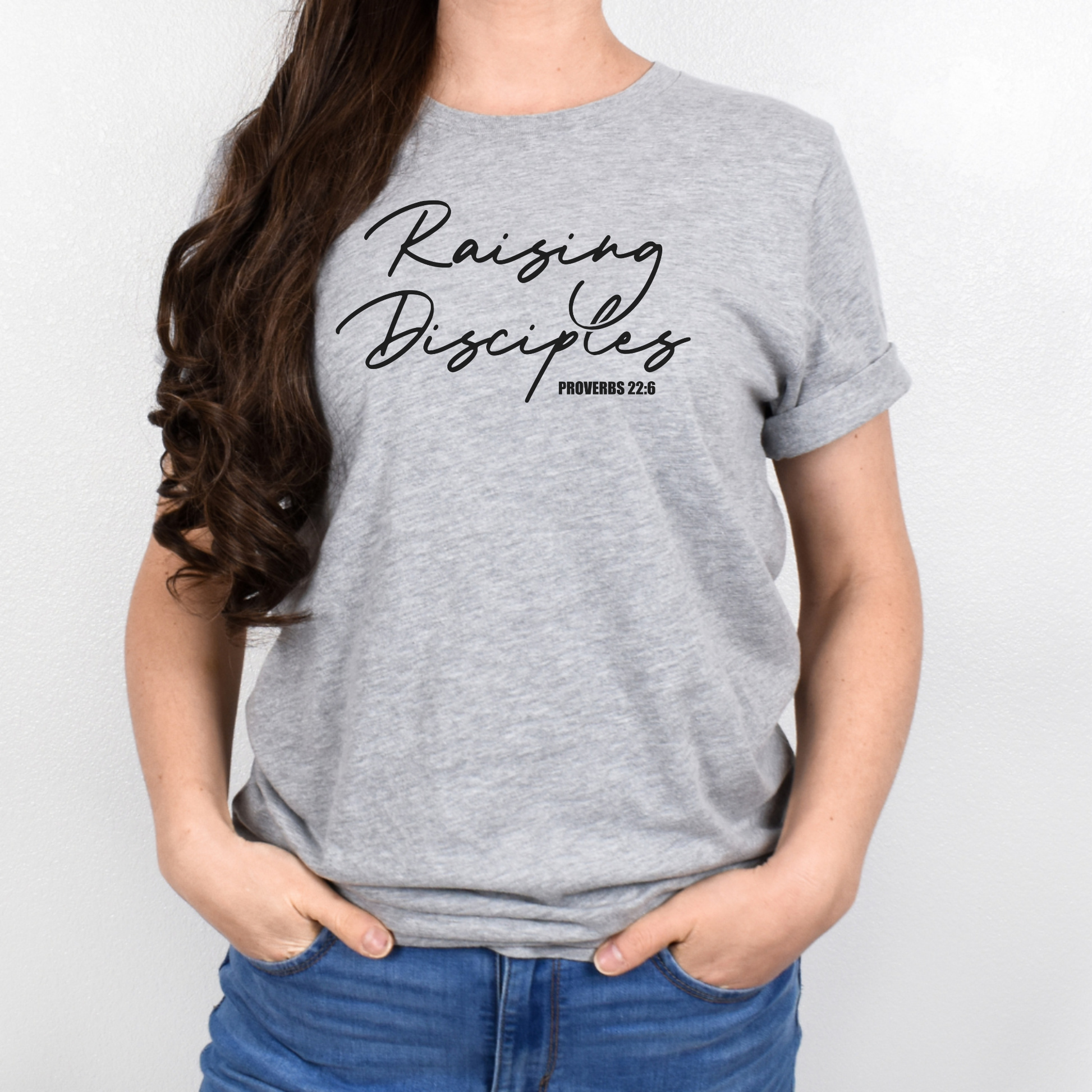Our Raising Disciples T-Shirt is a soft, faith-based reminder inspired by Proverbs 22:6, to guide our children to walk in faith. Made with a premium cotton & polyester blend for comfort that lasts, this Christian tee is perfect for moms who want to share their faith in a simple, meaningful way.